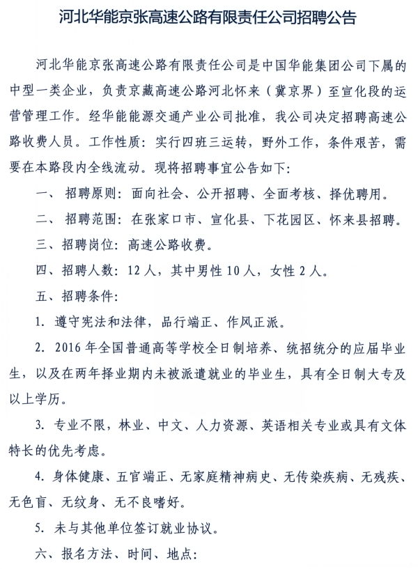 京張高速公司2016年收費人員招聘公告