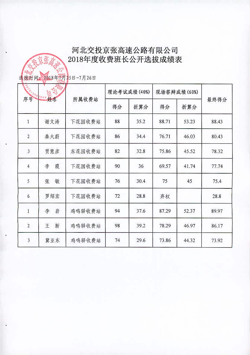 公司2018年收費(fèi)班長(zhǎng)公開選拔成績(jī)公示