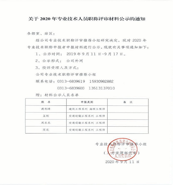 關(guān)于2020年專業(yè)技術(shù)人員職稱評(píng)審材料公示的通知